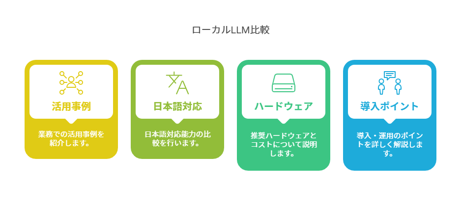 ローカルLLMを業務で活用する際、モデルごとの性能や適用業務の違い を理解することが重要です。