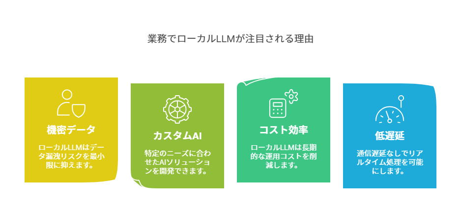 企業がローカルLLMを導入する最大の理由は、データの機密性と業務効率の向上 です。