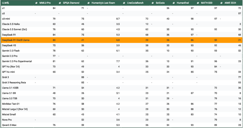 DeepSeek-R1-Distill-Llamaと各AIモデルのベンチマークデータは次の様になりました。