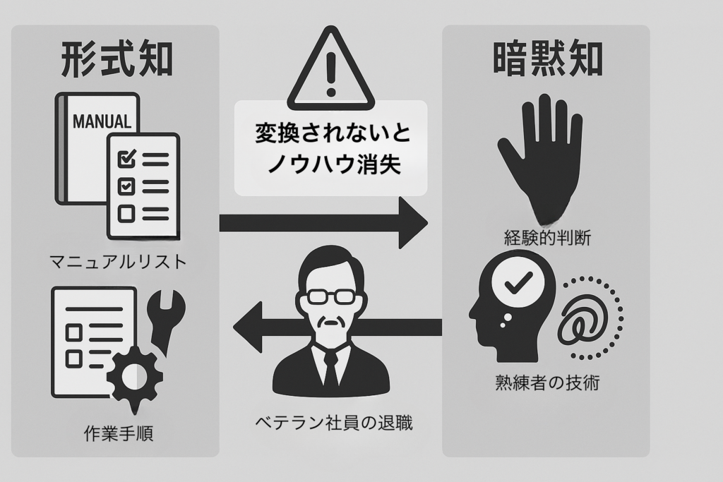 - 暗黙知:経験や勘、感覚的に身についたノウハウで、言語化されていない知識(例:熟練工の手の動き、商談時の空気の読み方)
