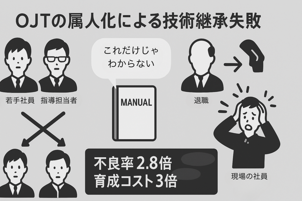 「OJTで教えているから問題ない」というのは、実は大きな誤解です。属人化したOJTには以下のようなリスクがあります。