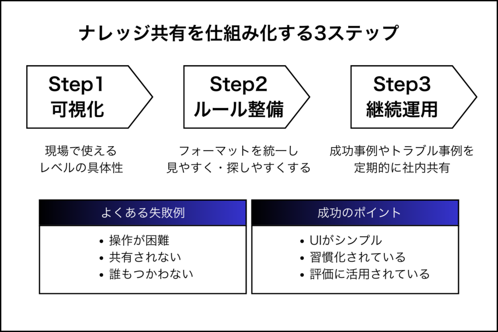 ナレッジマネジメントは「意識」だけでは浸透しません。ポイントは、知識の共有を“仕組みとして組み込む”こと。ここでは現場で実行可能なステップを3段階に分けて解説します。