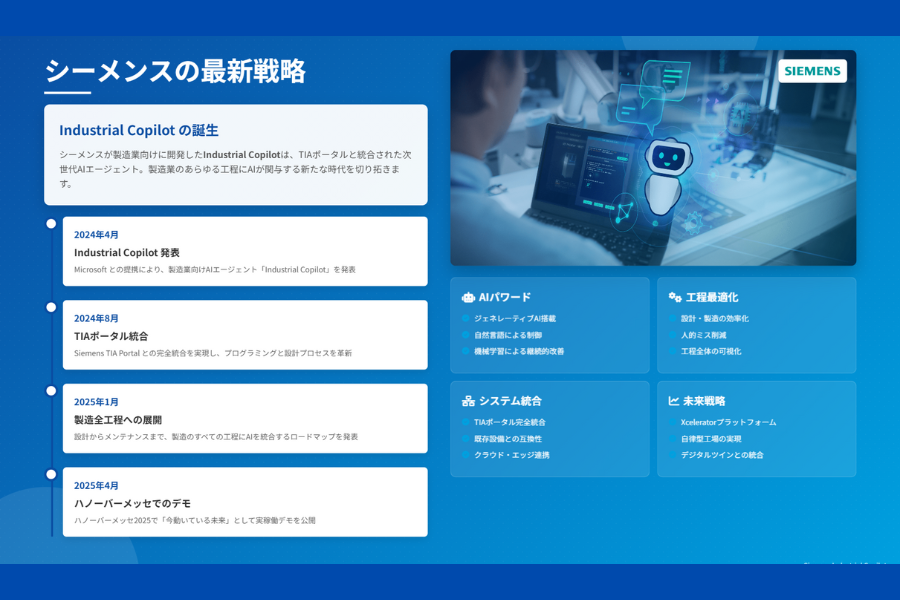 世界の製造業に革命をもたらすAIエージェント。その最前線に立つのが、ドイツの産業巨人シーメンスです。2025年のハノーバーメッセでは、シーメンスが描く“AI統合型バリューチェーン”の全貌が公開され、大きな注目を集めました。ここでは、その戦略の中核を成す「Siemens Industrial Copilot」を中心に、シーメンスのAI活用戦略を読み解いていきます。