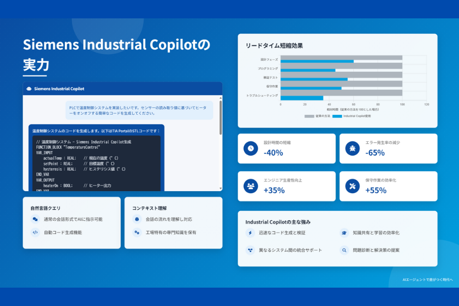 例えば、欧州のある自動車部品メーカーでは、Siemens Industrial Copilotを活用することで、PLCプログラミングにかかる時間を従来の約40%短縮。その結果、設計工程のリードタイムを全体で30%削減することに成功しました。