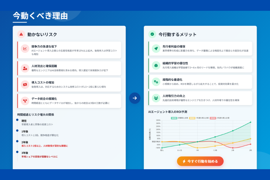 AIエージェントの進化は日進月歩。シーメンスのように既に導入・展開を進める企業と、まだ検討段階にとどまる企業との間には、今この瞬間にも「差」が広がっています。待つべきか、動くべきか――その選択は、数年後の競争力に直結します。ここでは、なぜ“今”なのか、その理由を明確にしていきましょう。