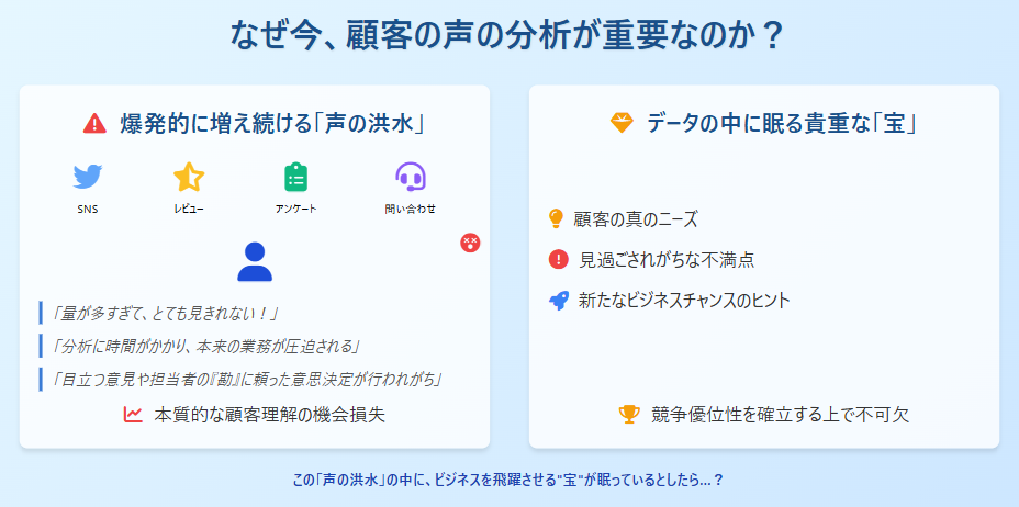 思い出してみてください。かつて顧客の声は、ハガキや電話が中心でした。しかし今はどうでしょう?Webアンケート、ECサイトのレビュー、問い合わせチャット、そしてX(旧Twitter)やInstagramといったSNS…。顧客との接点は爆発的に増え、そこから生まれるテキストデータは、まさに洪水のように押し寄せています!