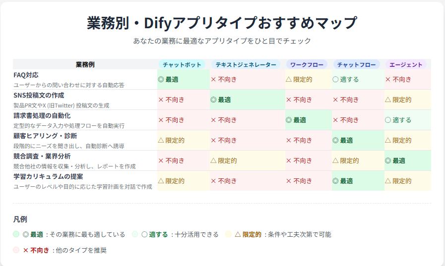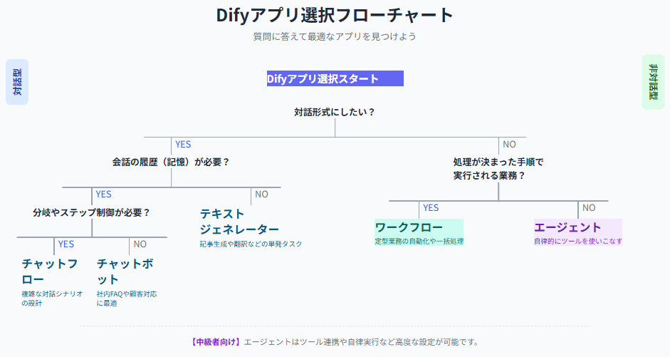 Difyは、ノーコード・ローコードでAIアプリを構築できる強力なプラットフォームですが、真価を発揮するには適切なアプリタイプの選択が不可欠です。