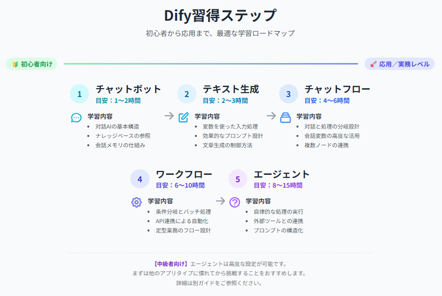 Difyには多機能なアプリタイプが揃っているため、いきなり高度な構築を目指すよりも、ステップを踏んで学習することが習得の近道です。ここでは、初心者が無理なくスキルアップできるおすすめの習得ステップと所要時間の目安を紹介します。