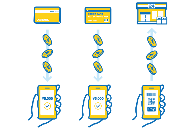専用アプリにコインを貯める(チャージする)には、信用金庫や自治体でQRコードから購入したり、加盟店舗で購入したりします。
