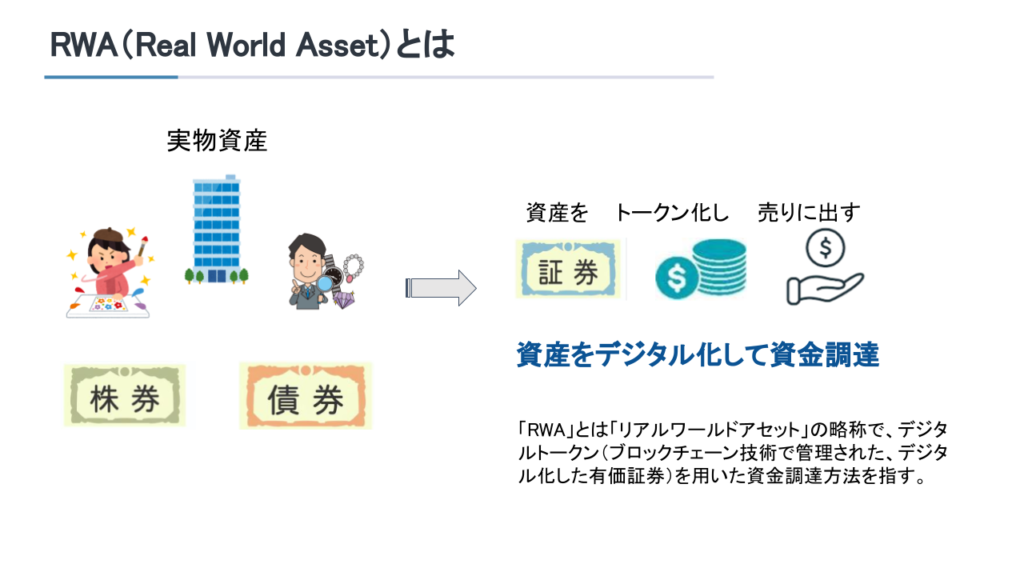 RWA(リアルワールドアセット)とは、実物資産(有形:不動産、貴金属、芸術品など、無形:株式、債券など)をトークン化し資金調達する手段のことです。