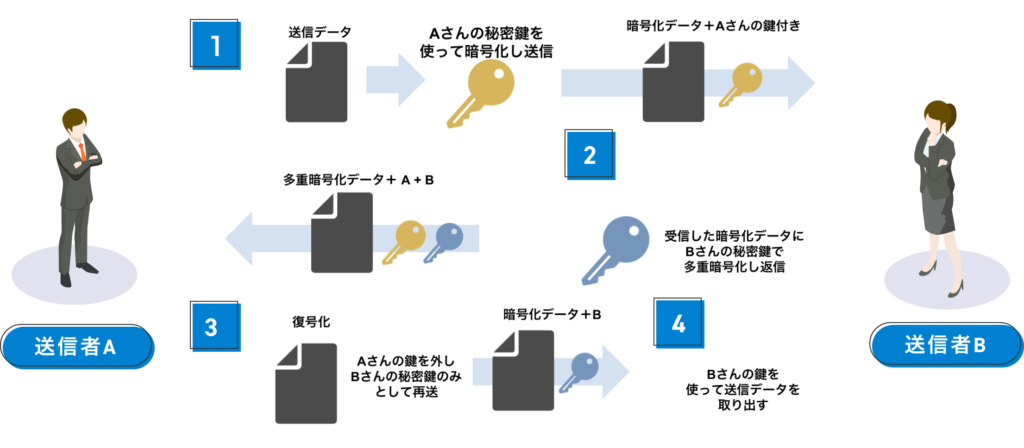 ユーザーとサーバー間で2回暗号・復号リクエストを行い、鍵輸送をせずに相手に秘匿通信を実施する方法